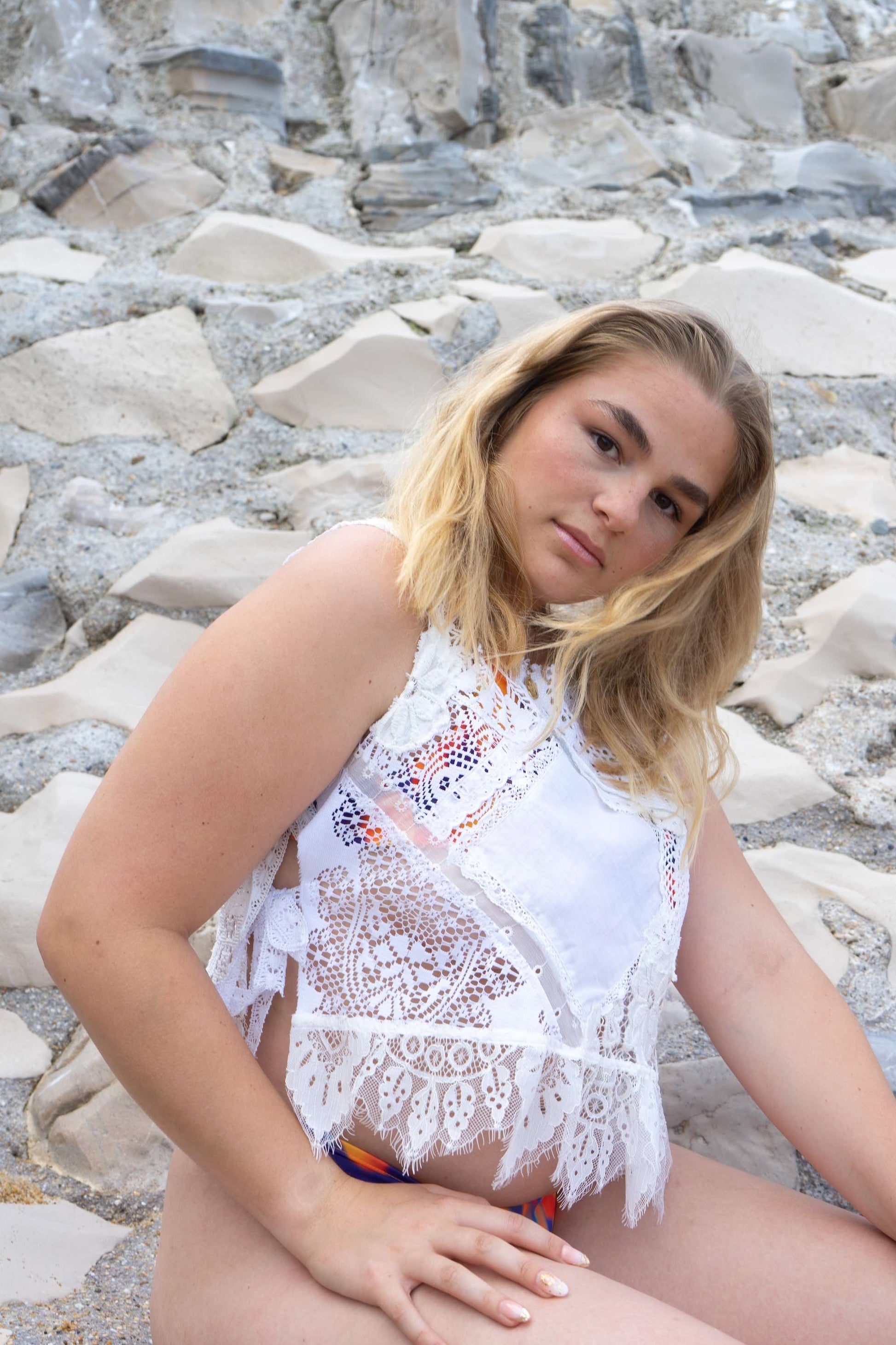 - Haut issu de matières revalorisées : napperons, rideaux, dentelles chinées
